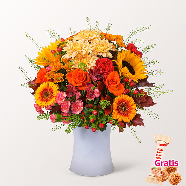 Blumenmix zum selber arrangieren: orange Rosen, orange-rote Germini, rote Alstromerie, orange Santini, rote Nelken, rotes Hypericum, orange Spraynelken, lachsfarbene Chrysanthemen, Sonnenblumen, rotes Eichenlaub und Thlaspi. Mit Pflegetipps, Blumennahrung und mit Wasser versorgt.