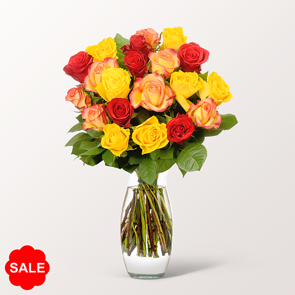 Rosenmix mit 20 Rosen Indian Summer in verschiedenen Farben ohne Schnittgrün. Die Rosen sind ca. 40 cm lang und haben eine Kopfgröße von ca. 3,5 cm. Frisch für Sie gebunden mit Pflegetipps, Blumennahrung und mit Wasser versorgt.