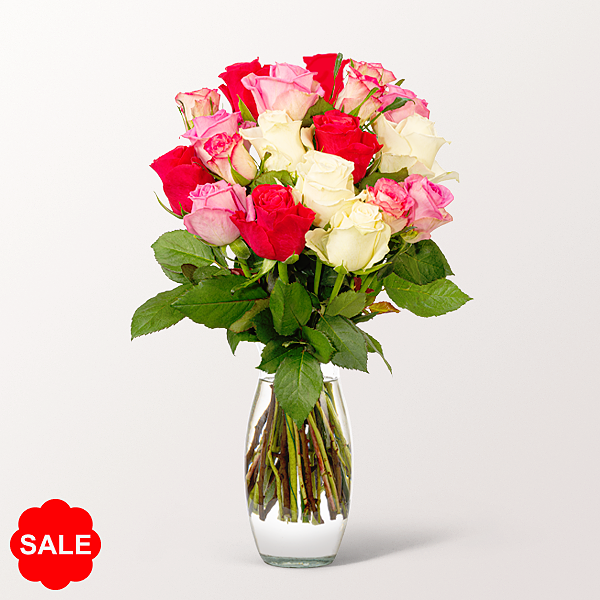 Rosenmix mit 20 Rosen Love in the Air in verschiedenen Farben ohne Schnittgrün. Die Rosen sind ca. 40 cm lang und haben eine Kopfgröße von ca. 3,5 cm. Frisch für Dich zusammengestellt, mit Pflegetipps, Blumennahrung und Wasser versorgt.