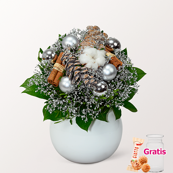 Stimmungsvoller Strauß mit silberfarbenem Schleierkraut, weißem Baumwollkopf, silberfarbenen glänzenden Weihnachtskugeln (4 cm), matt silberfarbenen Weihnachtskugeln (4 cm), Zimtstangen, Pinus peuce, Pistochia und Salal. Durchmesser ca. 25-30 cm. Frisch für Dich zusammengestellt, mit Pflegetipps, Blumennahrung und Wasser versorgt.
