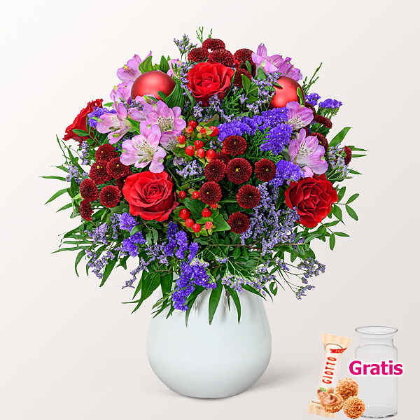 Umwerfender Blumenstrauß mit roten Rosen, roten Santiniballs, roten Hypericum, fliederfarbenen Alstromerie, blauen Statice, fliederfarbenem Limonium, blauer Thuja, matt roten Weihnachtskugeln (6 cm), Chico Jumbo und Pistochia. Durchmesser ca. 35 cm. Frisch für Dich zusammengestellt, mit Pflegetipps, Blumennahrung und Wasser versorgt.