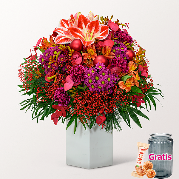 Luxuriöser Premiumstrauß mit rot-weißer Amaryllis, orangen Alstromerie, pinken Santini, rotem Schleierkraut, lilafarbenen Nelken, orangem Anigozanthos, rotem Eukalyptus, rot glänzenden Weihnachtskugeln (6 cm), Seidenkiefern, Chico Jumbo und Pistochia. Durchmesser ca. 55 cm. Frisch für Dich zusammengestellt, mit Pflegetipps, Blumennahrung und Wasser versorgt.Hinweis: Die Amaryllis des Straußes kommt im frischen und unaufgeblühten Zustand. Sie öffnet sich später als die anderen Blumen, je nach Standort und Temperatur. Dann bereitet der Strauß viel länger Freude.