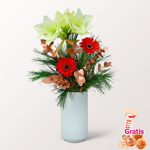 Blumenmix zum selber arrangieren: weiße Amaryllis, rote Germini, kupferfarbenes Eukalyptus und Kiefernzweige. Mit Pflegetipps, Blumennahrung und mit Wasser versorgt.Hinweis: Die Blumen kommen nicht als Strauß gebunden an. Der Beschenkte kann sie selber individuell in einer Vase arrangieren.Die Amaryllis des Straußes kommt im frischen und unaufgeblühten Zustand. Sie öffnet sich später als die anderen Blumen, je nach Standort und Temperatur. Dann bereitet der Strauß viel länger Freude.