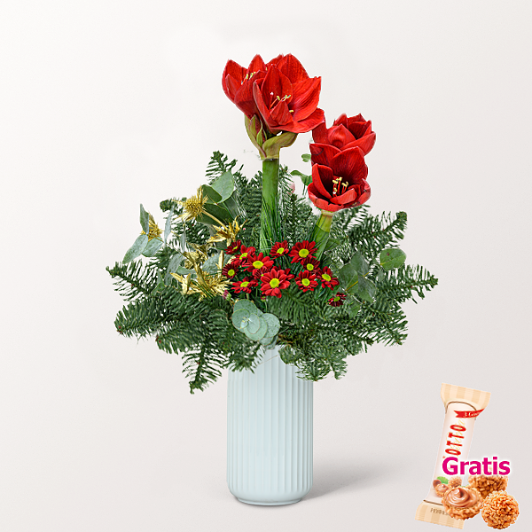 Blumenmix zum selber arrangieren: rote Amaryllis, rote Santini, goldfarbene Distel, Eukalyptus und Weihnachtsgrün. Mit Pflegetipps, Blumennahrung und mit Wasser versorgt.Hinweis: Die Blumen kommen nicht als Strauß gebunden an. Der Beschenkte kann sie selber individuell in einer Vase arrangieren.Die Amaryllis des Straußes kommt im frischen und unaufgeblühten Zustand. Sie öffnet sich später als die anderen Blumen, je nach Standort und Temperatur. Dann bereitet der Strauß viel länger Freude.