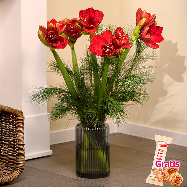 Für eine besonders festliche Überraschung: 3 oder 5 wunderschöne Amaryllis mit einer Länge von ca. 50 cm. Frisch für Dich zusammengestellt, mit Pflegetipps, Blumennahrung und Wasser versorgt.