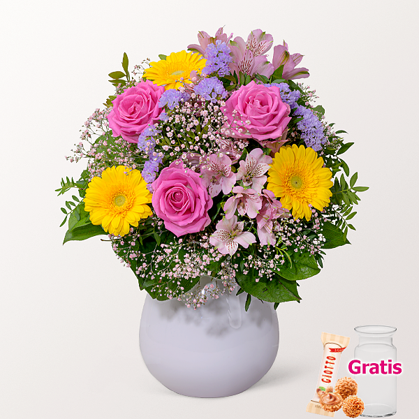 Märchenhafter Blumenstrauß mit rosa Rosen, fliederfarbener Statice, gelben Germini, hellrosa Schleierkraut, rosa Alstromerie, Pistochia und Salal. Durchmesser ca. 30 cm. Frisch für Dich zusammengestellt, mit Pflegetipps, Blumennahrung und Wasser versorgt.