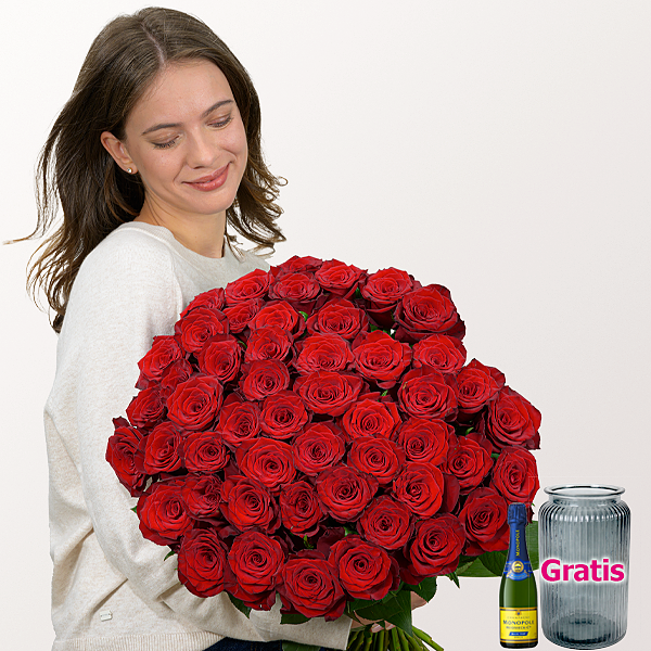 Geschmackvoller Premiumstrauß mit 50 roten Premiumrosen (70 cm Länge) und Aspidistra. Durchmesser ca. 55 cm. Frisch für Dich zusammengestellt, mit Pflegetipps, Blumennahrung und Wasser versorgt.