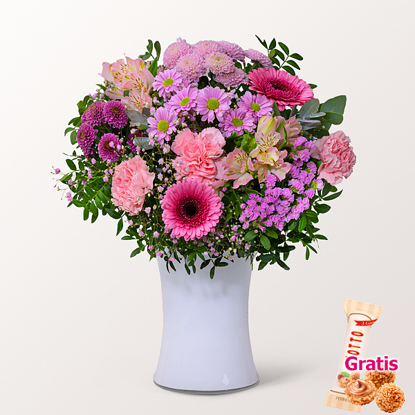 Blumenmix zum selber arrangieren: rosa Nelken, rosa Santiniball, pinker Santiniball, rosa Alstromerie, pinken Germini Isabelle, rosa Santini, rosa Schleierkraut, Eukalyptus und Pistochia. Mit Pflegetipps, Blumennahrung und mit Wasser versorgt.