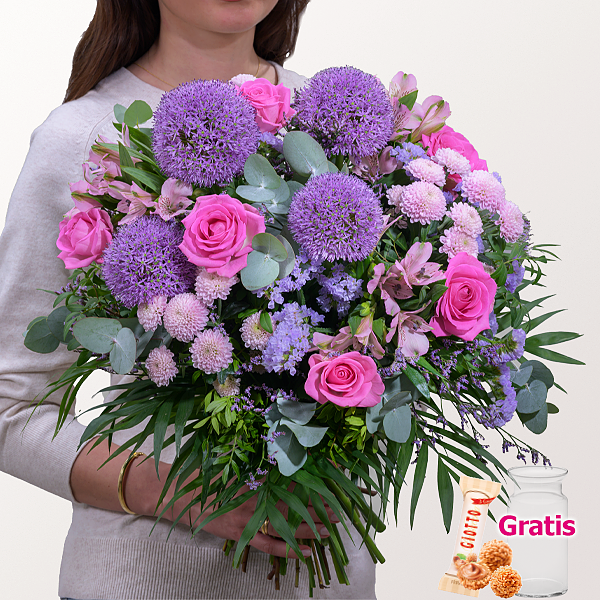 Umwerfender Blumenstrauß mit rosa Rosen, rosa Santiniballs, blauen Allium, rosa Alstromerie, fliederfarbenem Limonium, fliederfarbenen Statice, Eucalyptus, Chico Jumbo und Pistochia. Durchmesser ca. 40 cm. Frisch für Dich zusammengestellt, mit Pflegetipps, Blumennahrung und Wasser versorgt.