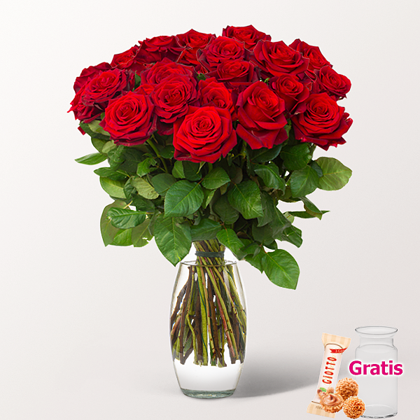 Romantisches Rosenpräsent mit 20 oder 30 roten Rosen, ohne Schnittgrün. Die Rosen sind ca. 40 cm lang. Frisch für Dich zusammengestellt, mit Pflegetipps, Blumennahrung und Wasser versorgt.