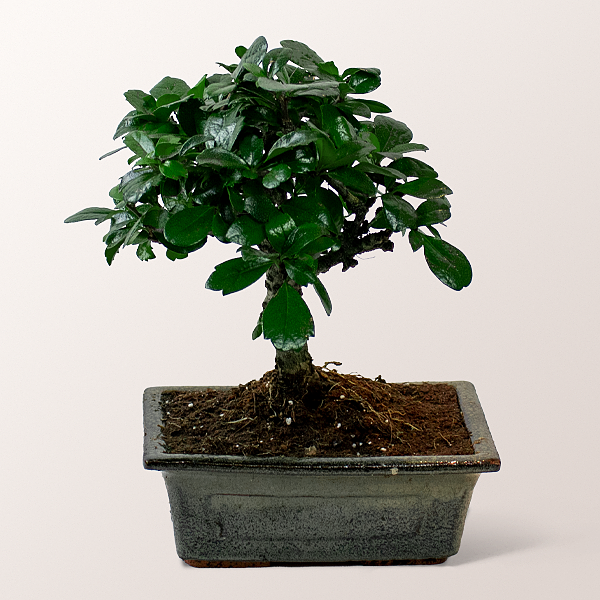 Dieser elegante Bonsai (Carmona) im Keramiktopf ist auch bekannt als Fukientee. Die Pflanze erreicht eine Höhe von ca. 20 cm und eine Breite von etwa 12-15 cm, was sie zu einem dekorativen Highlight für jedes Zuhause macht. Der blaue Keramiktopf wird von einem praktischen Untersetzer ergänzt, der mit einem Durchmesser von 15 cm perfekt auf die Pflanze abgestimmt ist. Ein stilvolles, jedoch anspruchvolles Element für die Wohnung oder das Büro.