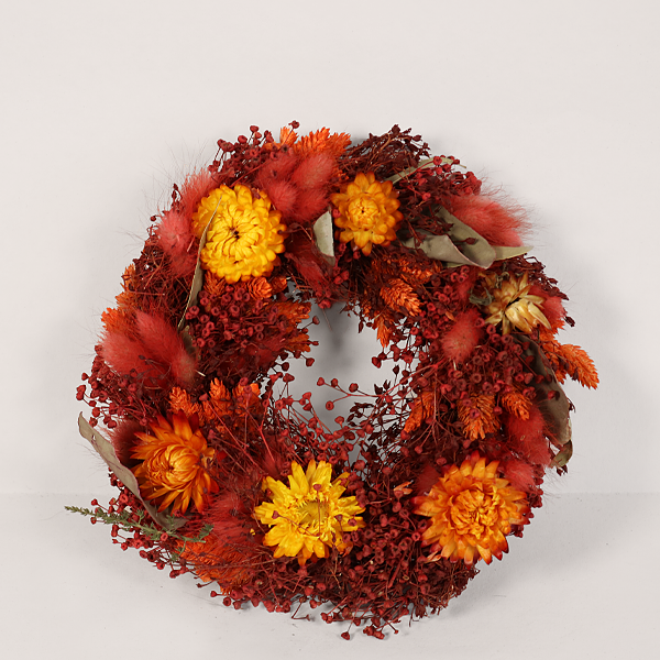 Dieser lebendige Trockenkranz in Rot, Orange und Grün vereint die Farbenpracht von Strohblumen, Lagurus, Rohrglanzgras, Phalaris und Schleierkraut. Ein fröhlicher Hingucker, der Deinem Zuhause warme Akzente setzt – perfekt als Dekoration oder als zeitloser Blickfang für Tür und Wand.