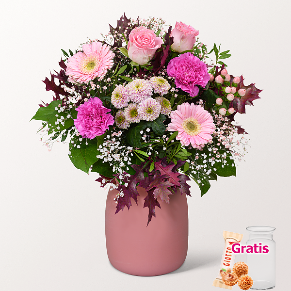 Ein romantischer Herbsttraum in Rosa- und Beerentönen. Dieser bezaubernde Strauß besteht aus hellrosafarbenen Rosen, rosafarbenen Germini, rosafarbenem Hypericum, pinken Nelken und rosafarbenen Santinibällen. Das brombeerfarbene Eichenlaub setzt einen wundervollen saisonalen Akzent. Umrahmt wird die Komposition von hellrosafarbenem Schleierkraut, Pistochia und Salal. Durchmesser ca. 30 cm. Frisch für Dich zusammengestellt, mit Pflegetipps, Blumennahrung und Wasser versorgt.