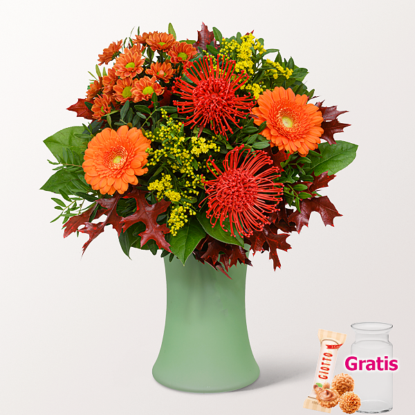 Ein feuriger Herbststrauß, der mit intensiven Rottönen beeindruckt. Rote Nadelkissen und orangefarbene Germini werden von Solidago und orangefarbener Santini begleitet. Das leuchtend rote Eichenlaub unterstreicht den saisonalen Charakter dieses Arrangements. Frische Pistochia und Salal bilden den grünen Rahmen. Durchmesser ca. 30 cm. Frisch für Dich zusammengestellt, mit Pflegetipps, Blumennahrung und Wasser versorgt.