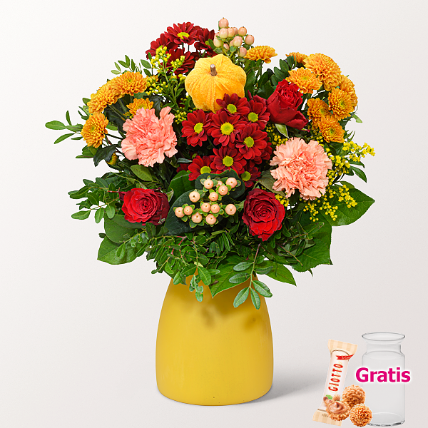 Ein intensiver Herbstgruß mit einem besonderen saisonalen Highlight. Rote Rosen, orangefarbene Nelken, lachsfarbenes Hypericum, rote Santini und orangefarbene Santinibälle bilden ein leuchtendes Farbenspiel. Das absolute Highlight ist der dekorative, gelbe Samtkürbis am Stab, der den Herbst perfekt in Szene setzt. Frische Pistochia, Solidago und Salal ergänzen das Arrangement. Durchmesser ca. 30 cm. Frisch für Dich zusammengestellt, mit Pflegetipps, Blumennahrung und Wasser versorgt.