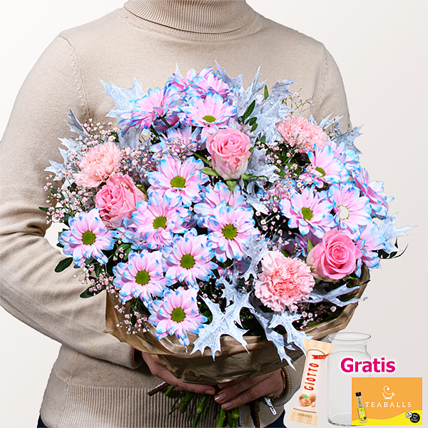 Ein himmlischer Strauß in Blau- und Rosatönen, der an einen klaren Herbsthimmel erinnert. Rosa-blaue Chrysanthemen, hellrosafarbene Rosen und rosafarbene Nelken bilden eine zarte Harmonie. Weißes Eichenlaub sorgt für einen außergewöhnlichen, hellen Akzent. Umspielt wird das Arrangement von hellrosafarbenem Schleierkraut und Pistochia. Durchmesser ca. 40 cm. Frisch für Dich zusammengestellt, mit Pflegetipps, Blumennahrung und Wasser versorgt.