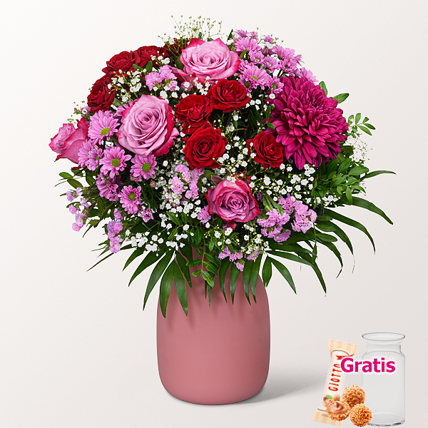 Eine elegante und zugleich ausdrucksstarke Komposition in Rosa- und Rottönen. Pinke Rosen, rote Sprayrosen und rosafarbene Santini werden durch eine brombeerfarbene Dekochrysantheme und rosa Statice ergänzt. Begleitet wird das Arrangement von weißem Schleierkraut, Pistochia und Chico Jumbo. Durchmesser ca. 40 cm. Frisch für Dich zusammengestellt, mit Pflegetipps, Blumennahrung und Wasser versorgt.