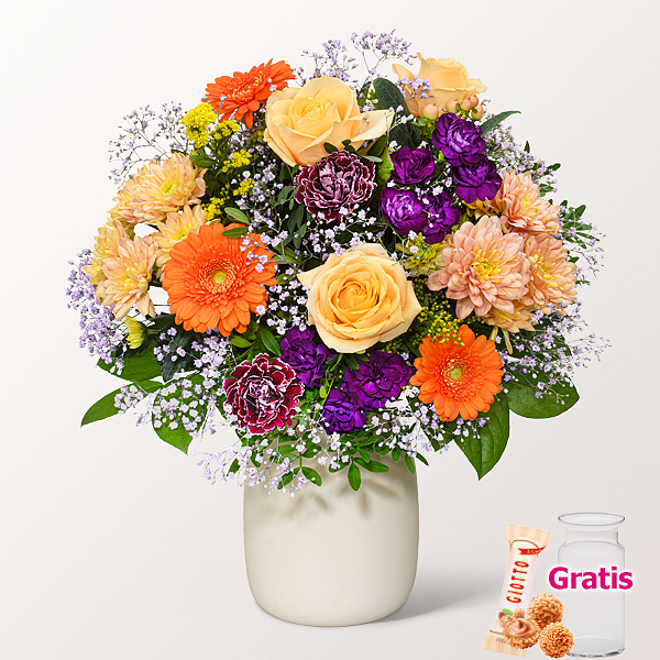Eine vielfältige Komposition, die an eine blühende Herbstwiese erinnert. Lachsfarbene Rosen, orangefarbene Germini, lachsfarbenes Hypericum, lachsfarbene Chrysanthemen, lila Spraynelken und violett-weiße Nelken werden durch Solidago ergänzt. Fliederfarbenes Schleierkraut, Pistochia und Salal sorgen für Fülle und Frische. Durchmesser ca. 35 cm. Frisch für Dich zusammengestellt, mit Pflegetipps, Blumennahrung und Wasser versorgt.