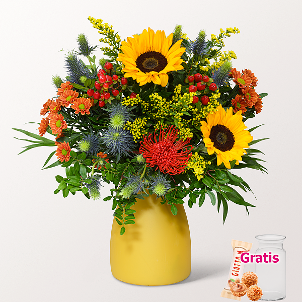 Ein prachtvoller Herbststrauß, der die Blicke auf sich zieht. Strahlende Sonnenblumen, rotes Nadelkissen, orangefarbene Santini, rotes Hypericum und blaue Disteln werden durch Solidago ergänzt. Das Arrangement wird von frischer Pistochia und Chico Jumbo umrahmt. Durchmesser ca. 40 cm. Frisch für Dich zusammengestellt, mit Pflegetipps, Blumennahrung und Wasser versorgt.