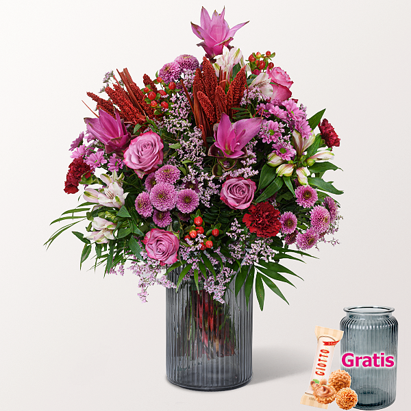 Ein opulenter Premiumstrauß in tiefen, warmen Herbstfarben. Pinke Curcuma, pinke Rosen, rosafarbene Alstromerie, rosafarbene Santini, pinke Santinibälle und bordeauxfarbene Nelken sorgen für eine luxuriöse Ausstrahlung. Rotes Hypericum und rosafarbenes Limonium ergänzen die Blütenpracht. Rote Setaria-Bündchen, Chico Jumbo und Pistochia geben dem Arrangement eine beeindruckende Fülle. Durchmesser ca. 50 cm. Frisch für Dich zusammengestellt, mit Pflegetipps, Blumennahrung und Wasser versorgt.