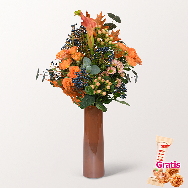 Ein eleganter, hochgebundener Blumenmix in leuchtendem Orange. Eine orangefarbene Calla ist der edle Mittelpunkt, umgeben von orangefarbenen Sprayrosen, orangefarbenem Hypericum, lachsfarbene Santini und blaues Viburnum. Orangefarbenes Eichenlaub, Eukalyptus und Panicumgras unterstreichen den schlanken und modernen Charakter des Arrangements. Frisch für Dich zusammengestellt, mit Pflegetipps, Blumennahrung und Wasser versorgt.
