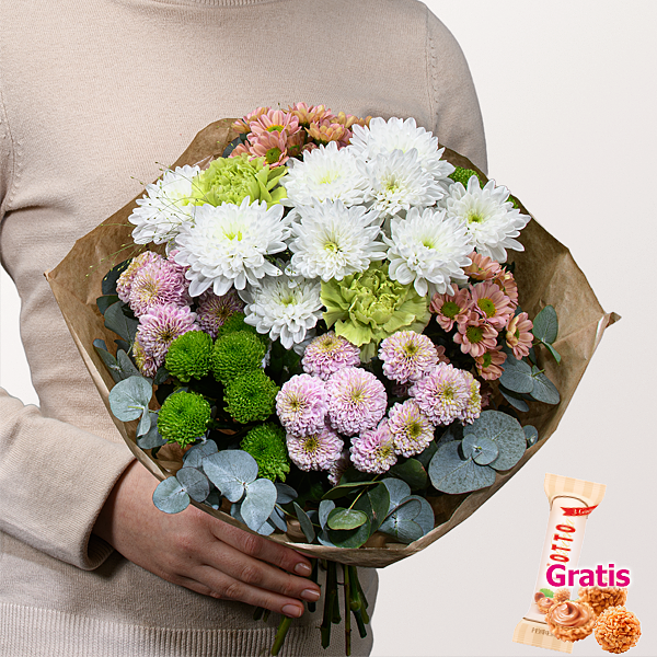 Ein frischer Blumenmix in einer klaren Weiß-Grün-Kombination mit zarten Farbakzenten. Weiße Chrysanthemen, grüne Nelken und grüne Santinibälle bilden eine harmonische Basis. Lachsfarbene Santini und rosafarbene Santinibälle setzen sanfte Highlights. Die Komposition wird durch Eukalyptus und Panicum abgerundet. Frisch für Dich zusammengestellt, mit Pflegetipps, Blumennahrung und Wasser versorgt.
