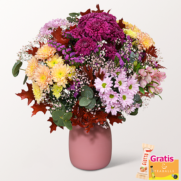 Ein herbstlicher Blumenmix in warmen, harmonischen Farbtönen. Lachsfarbene und rosafarbene Chrysanthemen treffen auf rosafarbene Alstromeria und brombeerfarbene Chrysantheme. Rotes Eichenlaub und pinke Statice setzen saisonale Akzente, während hellrosafarbenes Schleierkraut und Eukalyptus für eine luftige Note sorgen. Frisch für Dich zusammengestellt, mit Pflegetipps, Blumennahrung und Wasser versorgt.