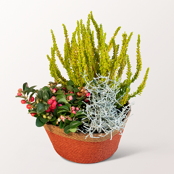 Eine hübsche Mischung aus orange-grüner Besenheide, roter Scheinbeere und einer Stacheldrachtpflanze in einem zweifarbigen Korb (Ø ca. 16 cm). Die Pflanzen sind ca. 30 cm hoch.Hinweis: Bitte beachte, dass der Lieferzustand teilweise nicht mit Blüten erfolgt.Die Pflanzen sind giftig.Hersteller:FloraPrima GmbHDidderser Str. 2838176 Wendeburginfo@floraprima.de