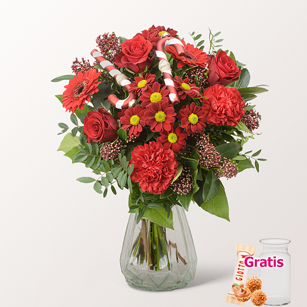 Ein leuchtender Weihnachtsgruß in kräftigem Rot: Rote Rosen, rote Santini, rote Germini und rote Nelken werden von eleganter roter Skimmie begleitet. Dekorative Zuckerstangen verleihen dem Strauß eine verspielte, festliche Note. Pistochia und Salal sorgen für den grünen Rahmen. Durchmesser ca. 30 cm. Frisch für Dich zusammengestellt, mit Pflegetipps, Blumennahrung und Wasser versorgt.