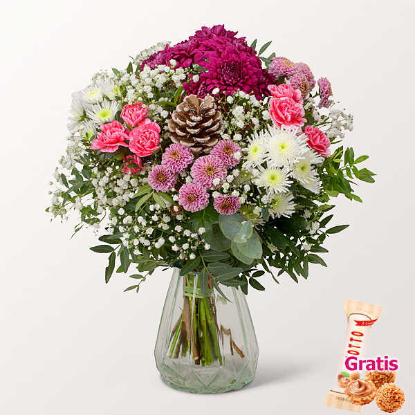 Dieser festliche Weihnachtsmix verzaubert mit einer Komposition aus brombeerfarbenen Chrysanthemen, rosafarbenen Santinibällen, weißen Santini und zarten rosa-weißen Spraynelken. Ein besonderer Hingucker sind die winterlichen, weiß-gespitzten Zapfen. Abgerundet wird das Arrangement mit weißem Schleierkraut, Pistochia und Eukalyptus. Frisch für Dich zusammengestellt, mit Pflegetipps, Blumennahrung und Wasser versorgt.Hinweis: Die Blumen kommen nicht als Strauß gebunden an. Der Beschenkte kann sie selber individuell in einer Vase arrangieren.