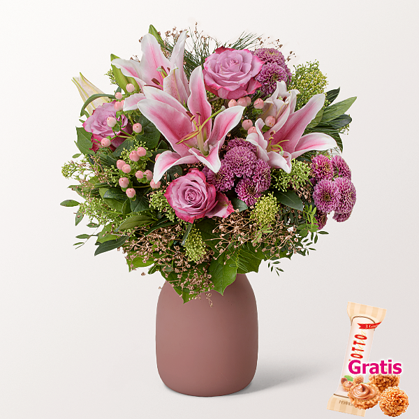 Ein eleganter Blumenmix, in dem zart rosa Lilien und weiße Skimmie auf kräftige, lila Rosen und pinke Santinibälle treffen. Rosa Hypericum und kupferfarbenes Schleierkraut fügen warme Akzente hinzu. Seidenkiefer und Salal bilden die winterliche grüne Basis. Frisch für Dich zusammengestellt, mit Pflegetipps, Blumennahrung und Wasser versorgt.Hinweis: Die Blumen kommen nicht als Strauß gebunden an. Der Beschenkte kann sie selber individuell in einer Vase arrangieren.Die Lilien des Straußes kommen im frischen und unaufgeblühten Zustand. Sie öffnen sich später als die anderen Blumen, je nach Standort und Temperatur. Dann bereitet der Strauß viel länger Freude.