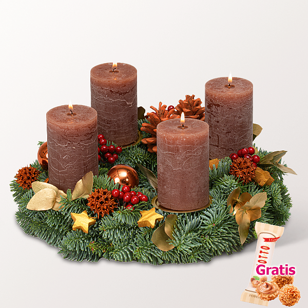 Warme und erdige Töne vereint dieser Adventskranz auf einer Basis aus Nobilisgrün. Vier maronefarbene Rustikakerzen (9 x 6 cm) auf goldfarbenen Kerzentellern werden durch glänzend orangefarbene Weihnachtskugeln, orangefarbenen Amberbaumfrüchten und roten Beerentuffs ergänzt. Goldene Cocossterne, goldener Eukalyptus und orangefarbene Kiefernzapfen runden die weihnachtliche Komposition ab.