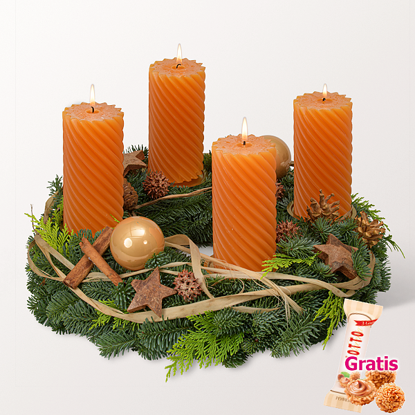Ein sonniger Lichtblick in der kalten Jahreszeit ist dieser große Adventskranz aus Nobilis. Vier gedrehte, safranfarbene Kerzen (14 x 7 cm) auf goldfarbenen Tellern leuchten um die Wette. Dekoriert mit einem natürlichen Maulbeerenband, Zimtstangen, Fichtenzapfen, gebleichten Kiefernzweigen, glänzend safranfarbenen Weihnachtskugeln, orange-gekälkten Amberbaumfrüchten und natürlichen Cocosternen.