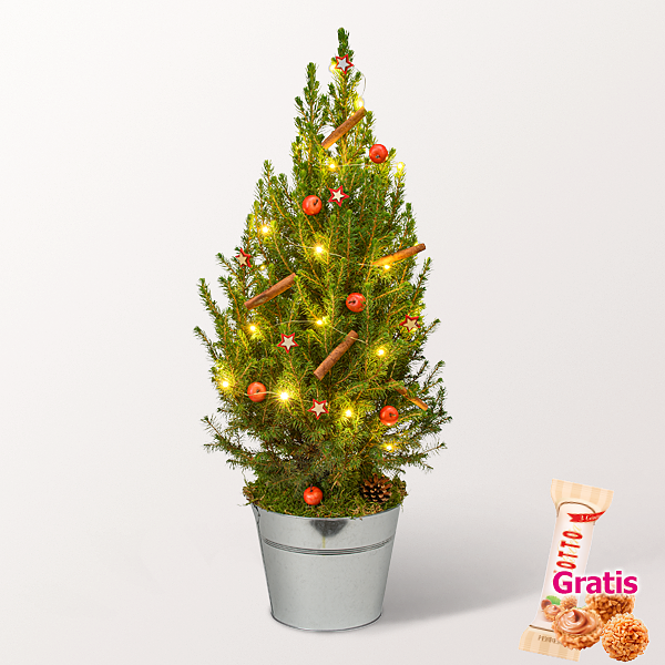 Verbreite festliche Stimmung mit dieser elegant dekorierten Zuckerhutfichte Picea Conica (60 - 80 cm inkl. Topf) im modernen, grauen Zinktopf. Das Bäumchen wird von einer 30er LED-Lichterkette (inkl. Batterien) zum Leuchten gebracht und ist geschmückt mit duftenden, natürlichen Zimtstangen, kleinen roten Äpfeln sowie rot-naturfarbenen Filzsternen. Natürliches Moos und Pinus Sylvestris unterstreichen den winterlichen Charakter. Die Dekoration liegt bei, so kannst Du den Baum nach Deinen eigenen Wünschen dekorieren.