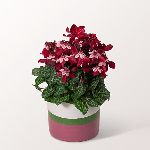 Für eine bunte Frühjahrszeit: Ein besonderes Alpenveilchen (Cyclame) in einem 3-farbigen Keramiktopf (ca. 13 cm), dekoriert mit einem pinken Schleifenband. Die Pflanzen ist ca. 30 cm hoch.Hinweis: Bitte beachte, dass der Lieferzustand teilweise nicht mit Blüten erfolgt.Hersteller:FloraPrima GmbHDidderser Str. 2838176 Wendeburginfo@floraprima.de