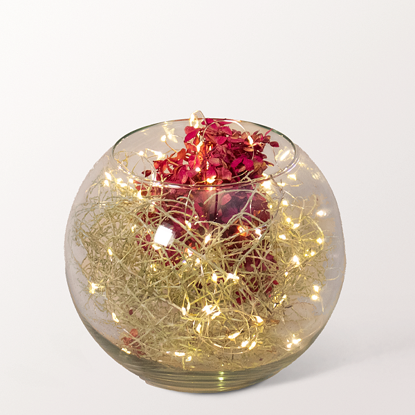Stimmungsvolles Arrangement im Glas (Ø ca. 12,3 cm). Gefüllt ist es mit einer getrockneten Hortensienblüte und einer Lichterkette. Die Lichterkette mit 40 Lichtern und Timerfunktion sorgt für eine stimmungsvolle Atmosphäre in der Adventszeit.Hersteller:FloraPrima GmbHDidderser Str. 2838176 Wendeburginfo@floraprima.de
