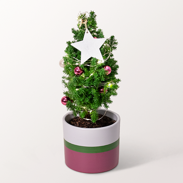 Süßer Weihnachtsbäumchen (Picea Glauca, ca. 30 cm) mit silberfarbenem Stern und Weihnachtskugeln in Zartrosa. Ergänzt wird dies durch einen hübschen Keramiktopf. Eine Lichterkette mit Timerfunktion sorgt für eine stimmungsvolle Atmosphäre in der Adventszeit. Das Bäumchen kann nach der Weihnachtszeit ausgepflanzt werden.Hinweis: Du erhältst den Baum ungeschmückt. So kommst Du in den Genuss des Baumschmückens mit Deinen Liebsten.Hersteller:FloraPrima GmbHDidderser Str. 2838176 Wendeburginfo@floraprima.de