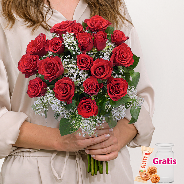Romantisches Rosenpräsent mit 18 roten Rosen umspielt von Schleierkraut. Die Rosen sind ca. 40 cm lang und haben eine Kopfgröße von ca. 3,5 cm. Frisch für Dich zusammengestellt, mit Pflegetipps, Blumennahrung und Wasser versorgt.