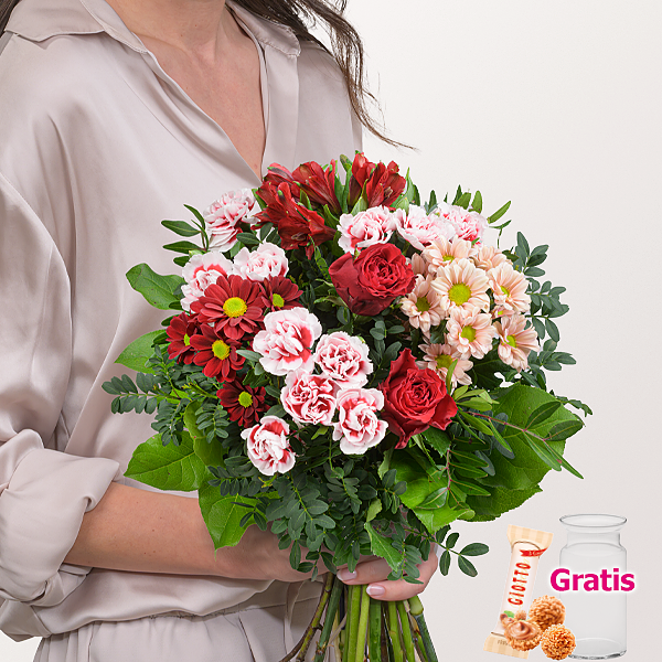 Rot-weiße Spraynelken werden mit lachsfarbenen und roten Santini sowie roten Rosen zu einem kompakten, kontrastreichen Strauß kombiniert. Rote Alstromerien ergänzen die Blütenstruktur, während Pistochia dem Arrangement Halt und Grün verleiht. Durchmesser ca. 30 cm. Frisch für Dich zusammengestellt, mit Pflegetipps, Blumennahrung und Wasser versorgt. Hersteller:FloraPrima GmbHDidderser Str. 2838176 Wendeburginfo@floraprima.de