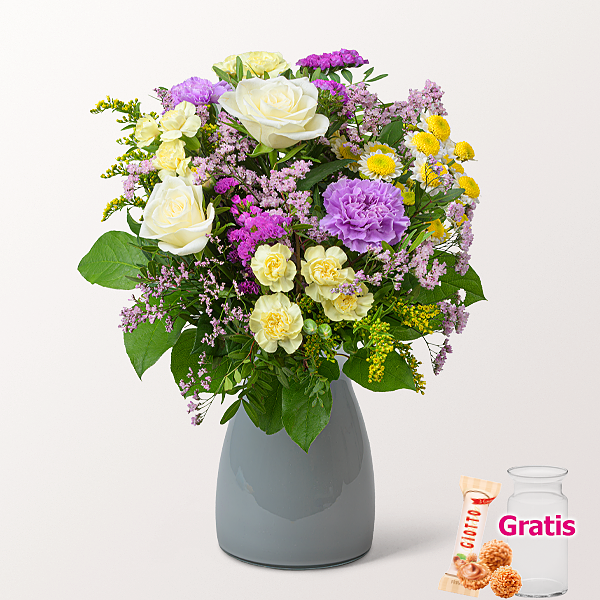 Weiße Rosen bilden die Basis dieses Straußes und werden von fliederfarbenen Nelken, pinker Statice und rosafarbenem Limonium ergänzt. Weiß-Gelbe Santini, hellgelbe Spraynelken und Solidago bringen Frische und Leichtigkeit in die Komposition. Abgerundet wird der Strauß mit Pistochia und Salal, die für Volumen und sattes Grün sorgen. Durchmesser ca. 30 cm. Frisch für Dich zusammengestellt, mit Pflegetipps, Blumennahrung und Wasser versorgt. Hersteller:FloraPrima GmbHDidderser Str. 2838176 Wendeburginfo@floraprima.de