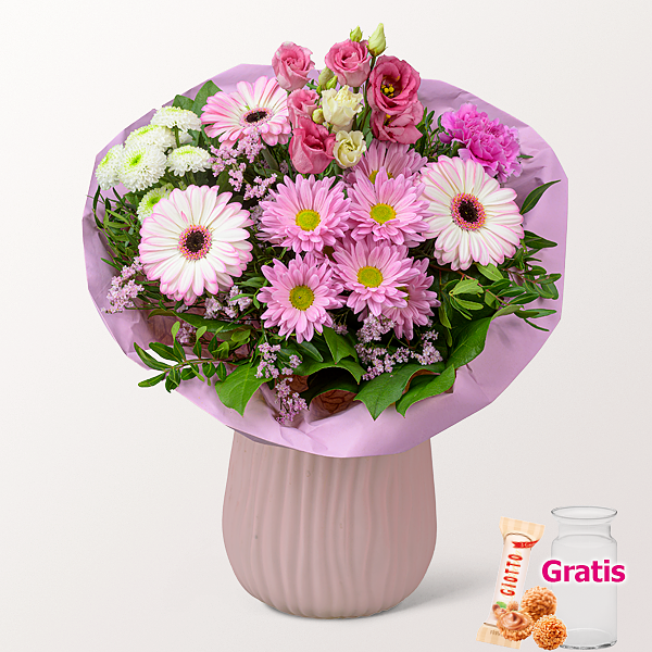 Rosafarbenes Lisianthus bildet den ruhigen Mittelpunkt dieses kompakten Straußes. Rosa-weiße Germini, rosafarbene Chrysanthemen, rosafarbenes Limonium, cremefarbene Santinibälle und pinke Nelken sorgen für eine weiche Blütenvielfalt. Pistochia, Salal und eine rosafarbene Manschette schließen die Komposition harmonisch ab. Durchmesser ca. 30 cm. Frisch für Dich zusammengestellt, mit Pflegetipps, Blumennahrung und Wasser versorgt. Hersteller:FloraPrima GmbHDidderser Str. 2838176 Wendeburginfo@floraprima.de