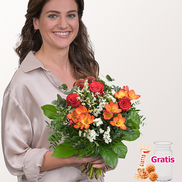 Rote Rosen werden mit orangen Freesien zu einer ausdrucksstarken Basis kombiniert. Ein roter Santiniball, weißes Limonium und weiße Statice setzen helle Akzente und geben Struktur. Eukalyptus, Pistochia und Salal tragen den Strauß mit frischem Grün und Volumen. Durchmesser ca. 30 cm. Frisch für Dich zusammengestellt, mit Pflegetipps, Blumennahrung und Wasser versorgt. Hersteller:FloraPrima GmbHDidderser Str. 2838176 Wendeburginfo@floraprima.de
