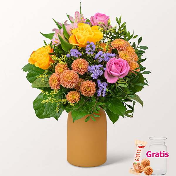 Rosa Rosen und hellorangene Rosen bilden den Mittelpunkt dieses Straußes. Lachsfarbene Santinibälle, fliederfarbene Statice und gelbes Limonium setzen farbige Akzente, während rosa Alstromerien zusätzliche Struktur bringen. Pistochia und Salal sorgen für Volumen und einen frischen grünen Rahmen. Durchmesser ca. 30 cm. Frisch für Dich zusammengestellt, mit Pflegetipps, Blumennahrung und Wasser versorgt.Hersteller:FloraPrima GmbHDidderser Str. 2838176 Wendeburginfo@floraprima.de