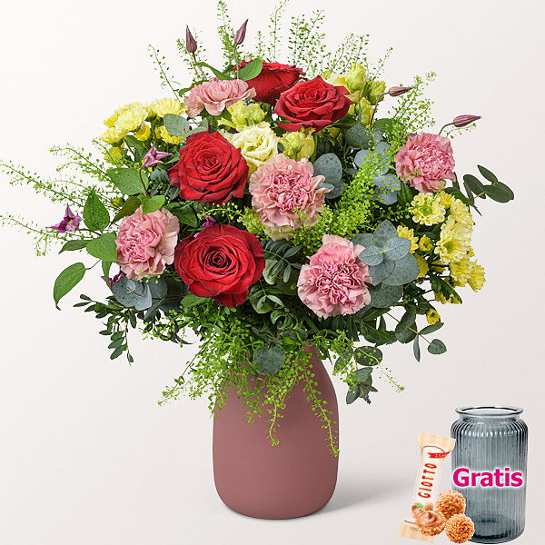 Rote Rosen Monte Carlo werden mit lilafarbener Clematis, hellgelbem Lisianthus und hellgelben Santini zu einem klaren, kontrastreichen Premiumstrauß kombiniert. Thlaspi und altrosafarbene Nelken bringen Struktur und Fülle. Eukalyptus und Pistochia geben dem Arrangement ein frisches, modernes Grün und Stabilität. Durchmesser ca. 40 cm. Frisch für Dich zusammengestellt, mit Pflegetipps, Blumennahrung und Wasser versorgt. Hersteller:FloraPrima GmbHDidderser Str. 2838176 Wendeburginfo@floraprima.de