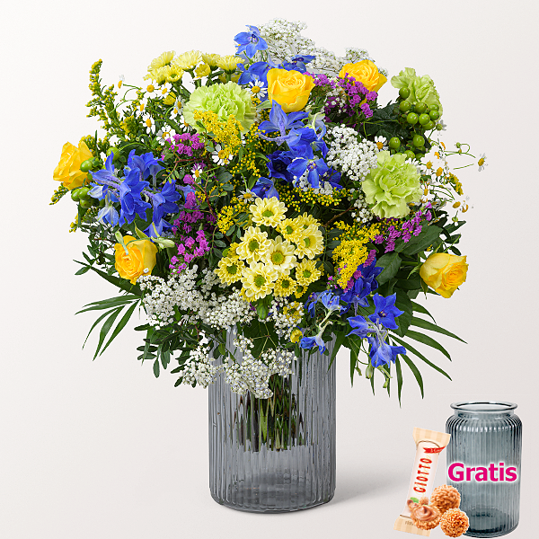 Gelbe Rosen werden mit blauem Delphinium zu einer klaren, kontrastreichen Basis kombiniert. Solidago, pinke Statice und hellgelbe Santini ergänzen die Blütenstruktur, während grüne Nelken, grünes Hypericum, Kamille und weißes Schleierkraut für Natürlichkeit sorgen. Pistochia und Chico Jumbo bilden das kräftige grüne Fundament dieses voluminösen Premiumstraußes. Durchmesser ca. 45 cm. Frisch für Dich zusammengestellt, mit Pflegetipps, Blumennahrung und Wasser versorgt. Hersteller:FloraPrima GmbHDidderser Str. 2838176 Wendeburginfo@floraprima.de