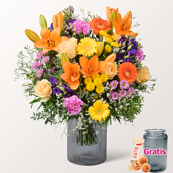 Orangefarbene Lilien vereinen sich mit lilafarbenem Lisianthus zu einem farbenfrohen Premiumstrauß. Rosafarbene Santini und gelbe Santinibälle sorgen für Tiefe und Kontrast. Rosen Avalanche Peach, pinke Nelken, gelbe und orange Germini sowie weißes Limonium werden von Pistochia und Chico Jumbo strukturiert getragen. Durchmesser ca. 45 cm. Frisch für Dich zusammengestellt, mit Pflegetipps, Blumennahrung und Wasser versorgt. Hinweis: Die Lilien kommen im frischen und unaufgeblühten Zustand. Sie öffnen sich später, je nach Standort und Temperatur. Hersteller:FloraPrima GmbHDidderser Str. 2838176 Wendeburginfo@floraprima.de
