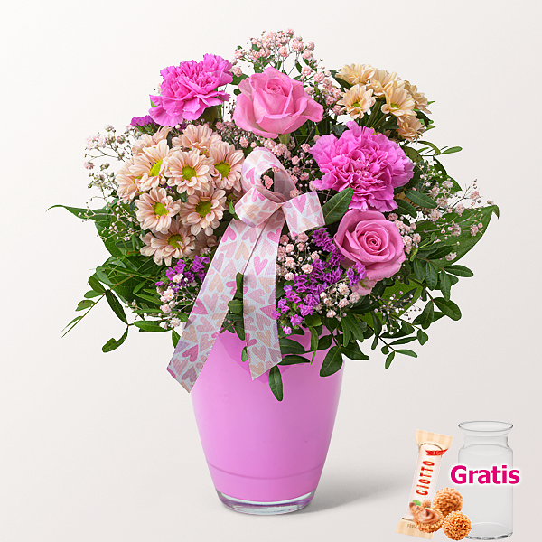 Rosafarbene Rosen werden mit pinker Statice und pinken Nelken zu einer sanften Blütenbasis kombiniert. Hellrosa gefärbtes Schleierkraut und lachsfarbene Santini sorgen für Leichtigkeit und warme Akzente. Pistochia und Salal geben dem Strauß Struktur, die Schleife mit Herzen setzt den dekorativen Abschluss. Durchmesser ca. 30 cm. Frisch für Dich zusammengestellt, mit Pflegetipps, Blumennahrung und Wasser versorgt. Hersteller:FloraPrima GmbHDidderser Str. 2838176 Wendeburginfo@floraprima.de