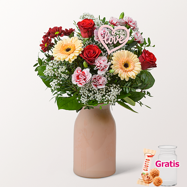 Rote Rosen werden mit weißem Schleierkraut und roten Santini zu einer klaren Blütenbasis kombiniert. Rot-weiße Spraynelken und cremefarbene Germini bringen Kontrast und Tiefe. Pistochia und Salal tragen das Grün, der Holzstecker „Ich liebe dich“ setzt den emotionalen Akzent. Durchmesser ca. 30 cm. Frisch für Dich zusammengestellt, mit Pflegetipps, Blumennahrung und Wasser versorgt. Hersteller:FloraPrima GmbHDidderser Str. 2838176 Wendeburginfo@floraprima.de