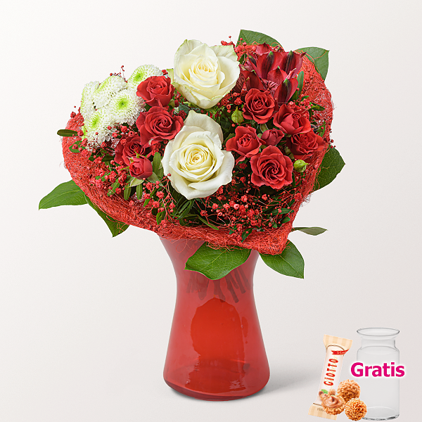 Weiße Rosen werden mit roten Sprayrosen zu einem klaren Farbkonzept arrangiert. Rot gefärbtes Schleierkraut, rote Alstromerie und ein weißer Santiniball ergänzen die Blütenstruktur. Pistochia und Salal sorgen für Stabilität, die rote Sisalherzmanschette bildet den markanten Abschluss. Durchmesser ca. 30 cm. Frisch für Dich zusammengestellt, mit Pflegetipps, Blumennahrung und Wasser versorgt. Hersteller:FloraPrima GmbHDidderser Str. 2838176 Wendeburginfo@floraprima.de