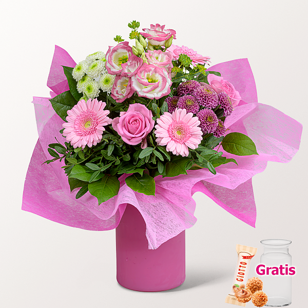 Rosafarbene Rosen werden mit rosafarbenen Germini und einem cremefarbenen Santiniball kombiniert. Rosa-weißes Lisianthus, Bupleurum und ein pinker Santiniball ergänzen das Blütenbild mit Leichtigkeit. Pistochia, Salal und eine rosa-pinke Manschette geben dem Strauß eine klare Form. Durchmesser ca. 30 cm. Frisch für Dich zusammengestellt, mit Pflegetipps, Blumennahrung und Wasser versorgt. Hersteller:FloraPrima GmbHDidderser Str. 2838176 Wendeburginfo@floraprima.de